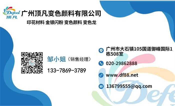 點(diǎn)擊:水性鋁銀漿的用途已經(jīng)很廣泛,不管是相機(jī)還是日常的水杯都能用在上面增添色彩。如果你在找水性鋁銀漿性價(jià)比比最高的廠家,那么找廣州頂凡變色顏料購(gòu)買準(zhǔn)沒(méi)錯(cuò)。不管是批發(fā)變色顏料還是零售頂凡顏料都可以給你最實(shí)惠的價(jià)格。